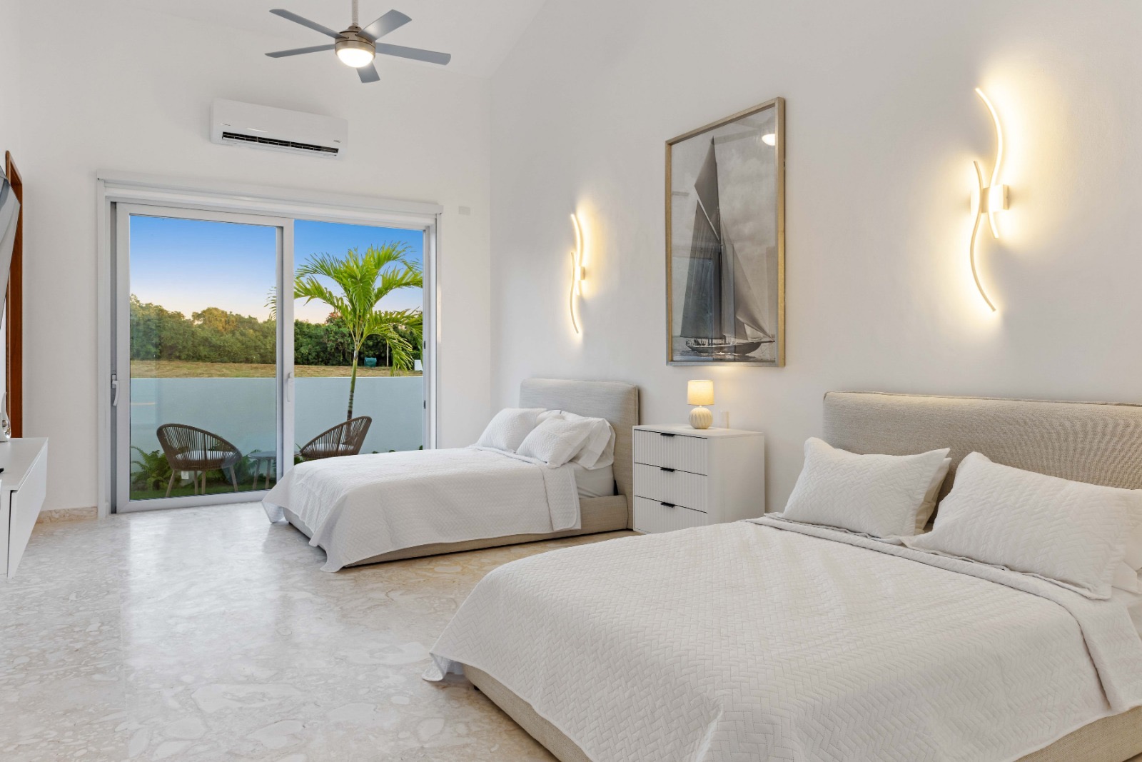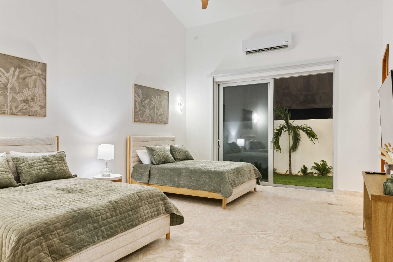 Each bedroom features modern décor, air conditioning, and private bathrooms designed for comfort and privacy.