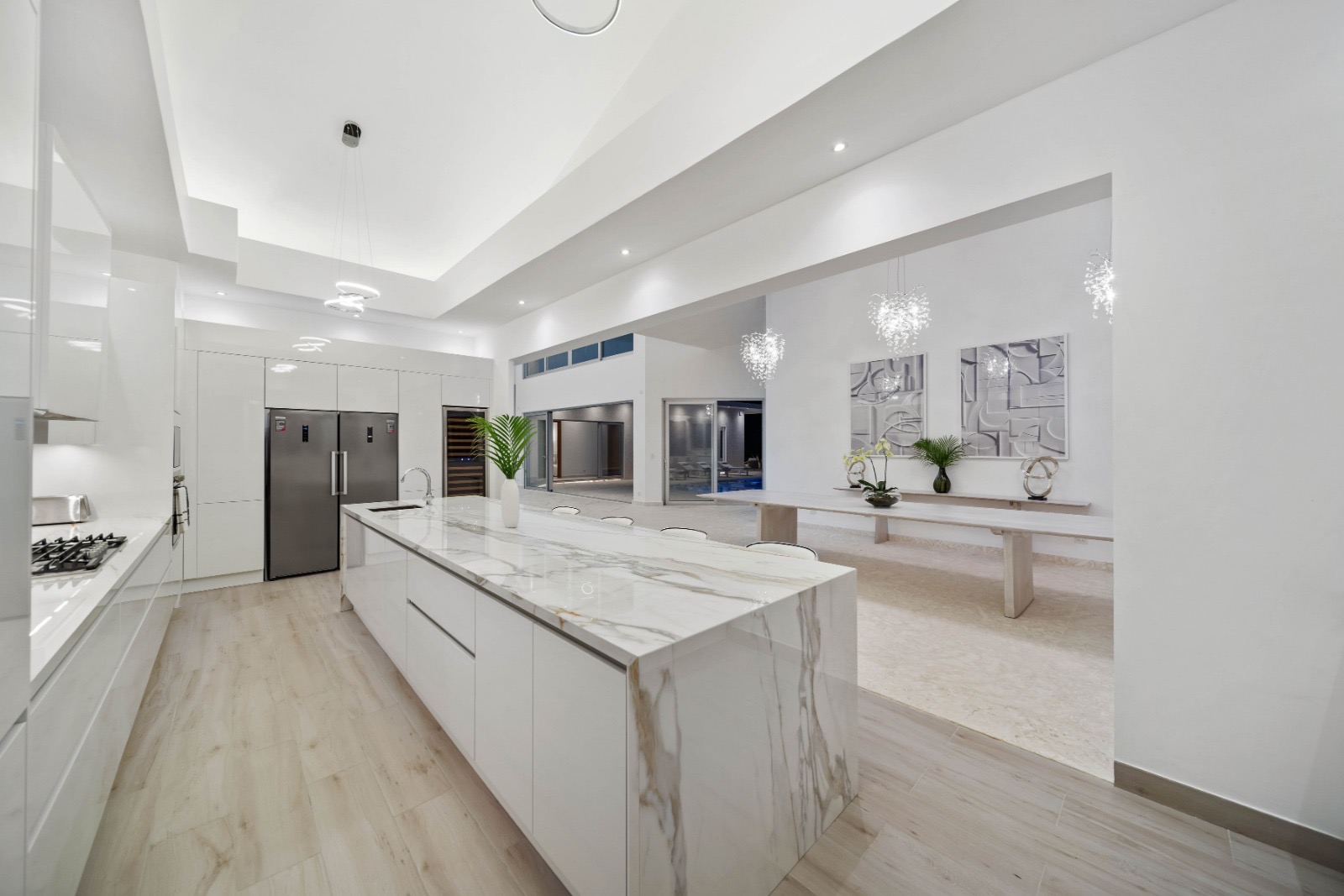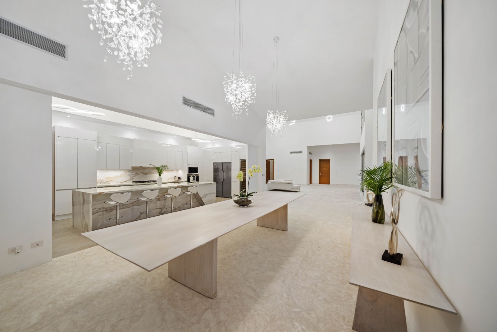 Villa Majesty welcomes guests into a spacious open-concept layout filled with natural light and contemporary design. The main living area flows seamlessly into the dining space and fully equipped kitchen, creating a perfect environment for gatherings and shared moments.